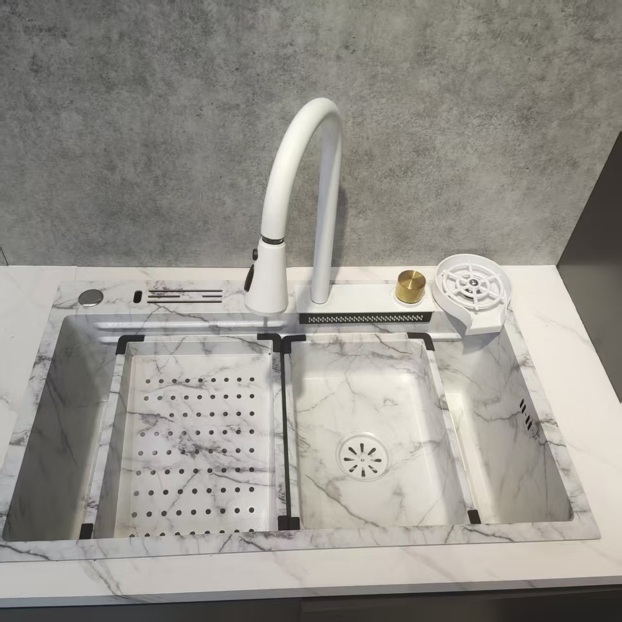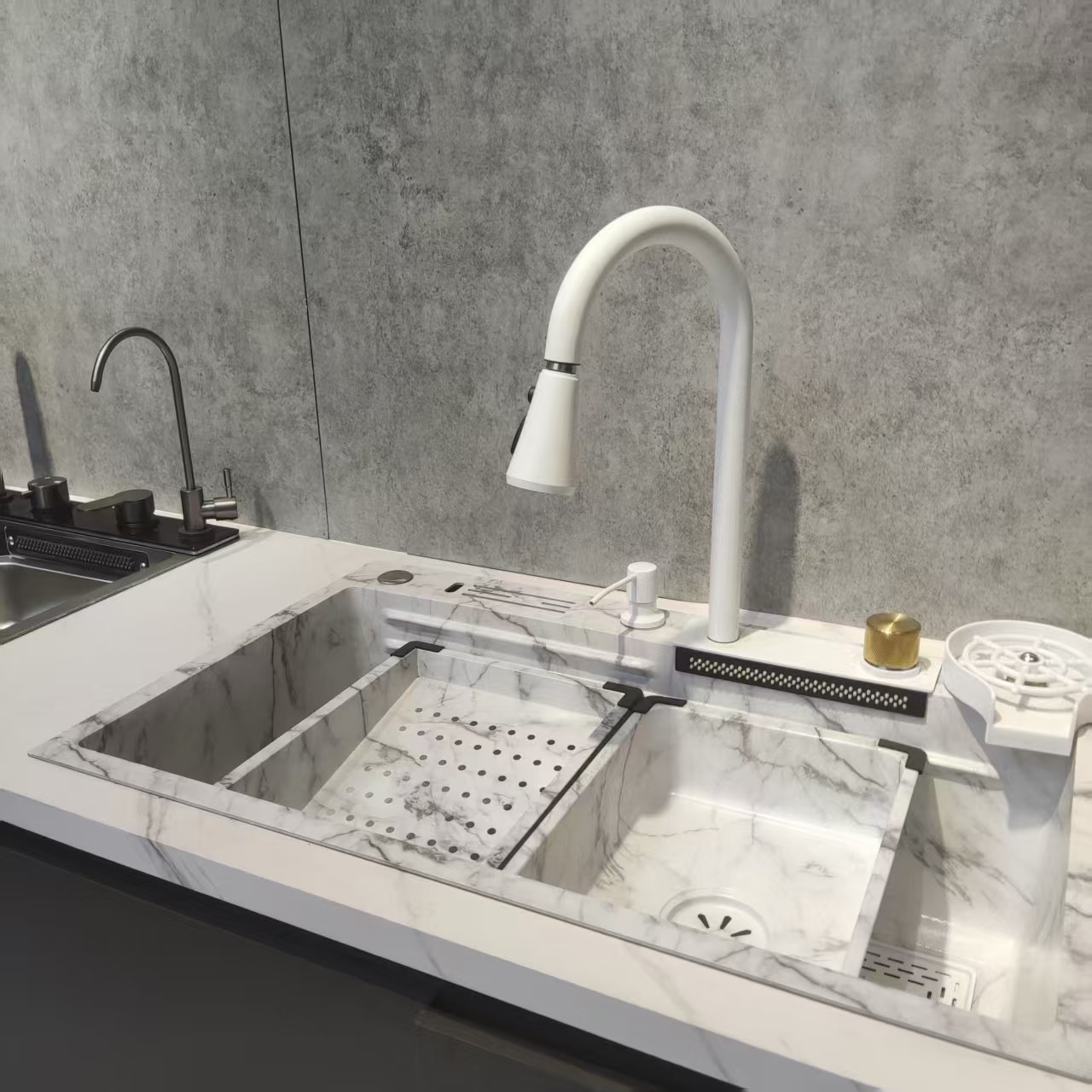 | Yüksek Kemerli Musluklu Çift Hazneli Mutfak Evyesi | 900×550×230mm | Geniş açılı su çıkışı |