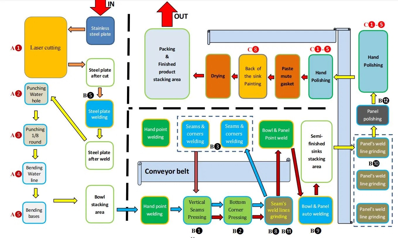Complete kitchen sink production line handmade sink manufacturing machine, the production line is a saving stainless steel material handmade sink manufacturing method. By splicing stainless steel sheets, the material utilization rate is improved, and the material cost of each sink is saved by about $1. At the same time, the investment in machinery and equipment is less, there is no need to customize the stamping die for the sink of different specifications and sizes, the production is flexible, the new product is put into production quickly and the investment is less. Manufactured kitchen sink high-grade and beautiful, and hot selling.